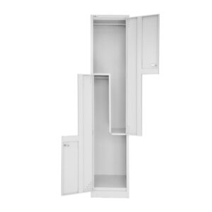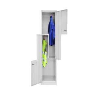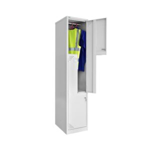 Our lockers are designed for durability, featuring a robust riveted construction and full-length stiffeners on each door for added security. The Step Door Locker includes two hanging compartments in a single unit. Delivered fully assembled and ready to use, it comes with a lock, two keys, and a coat rail in each compartment.