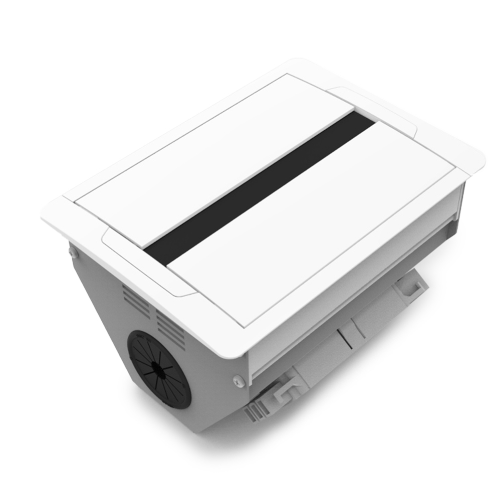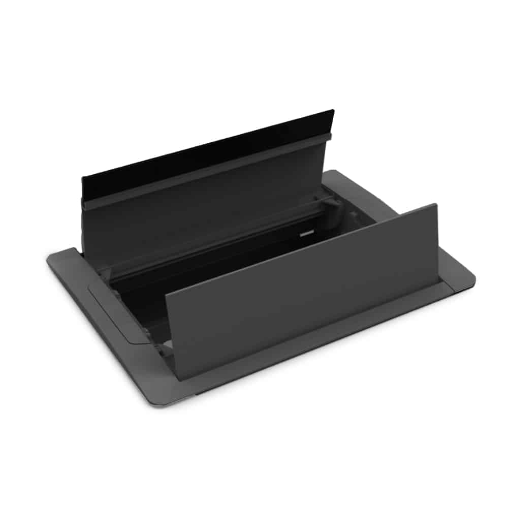 For easy access to power from the top of a desk, the Accede in-desk power module is the perfect way to declutter cables and keep your work space tidy and well-managed. These power boxes are installed in the desk-top, making access to GPOs and data quick and convenient. Its stylish design means it will blend in to any office, with is scalloped cable entry points keeping a sleek look. It also has additional cable brackets that clip onto the side to keep cables in order within the undercarriage. Between the two lids is a brush strip which helps to keep dirt and dust out of the module. These come as single lids as well, which have less GPOs and data and so are better suited for a smaller user base.