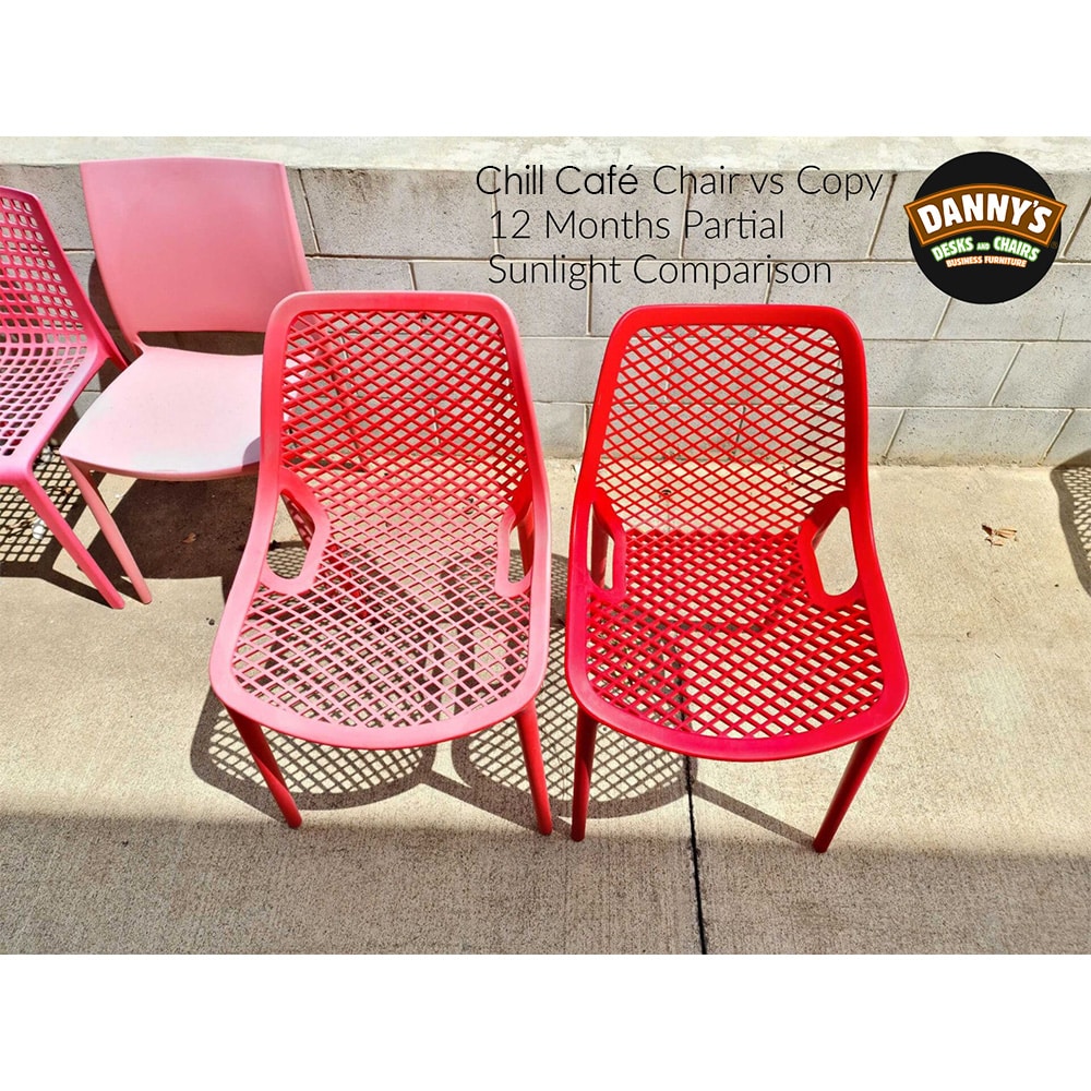 You may think that the Chill Caf? Chair is just another plastic chair, but you would be wrong. It is extremely strong due to it being one-piece injection moulded polypropylene, with the legs reinforced with glass fibre for even more stability. It is also packed with UV stabiliser, meaning that the sun won’t fade it or made it brittle no matter what conditions it faces. It is built for outdoor and indoor venues, where it strives by being lightweight and easy to move. It also comes in a wide range of colours to fit whatever look you want.