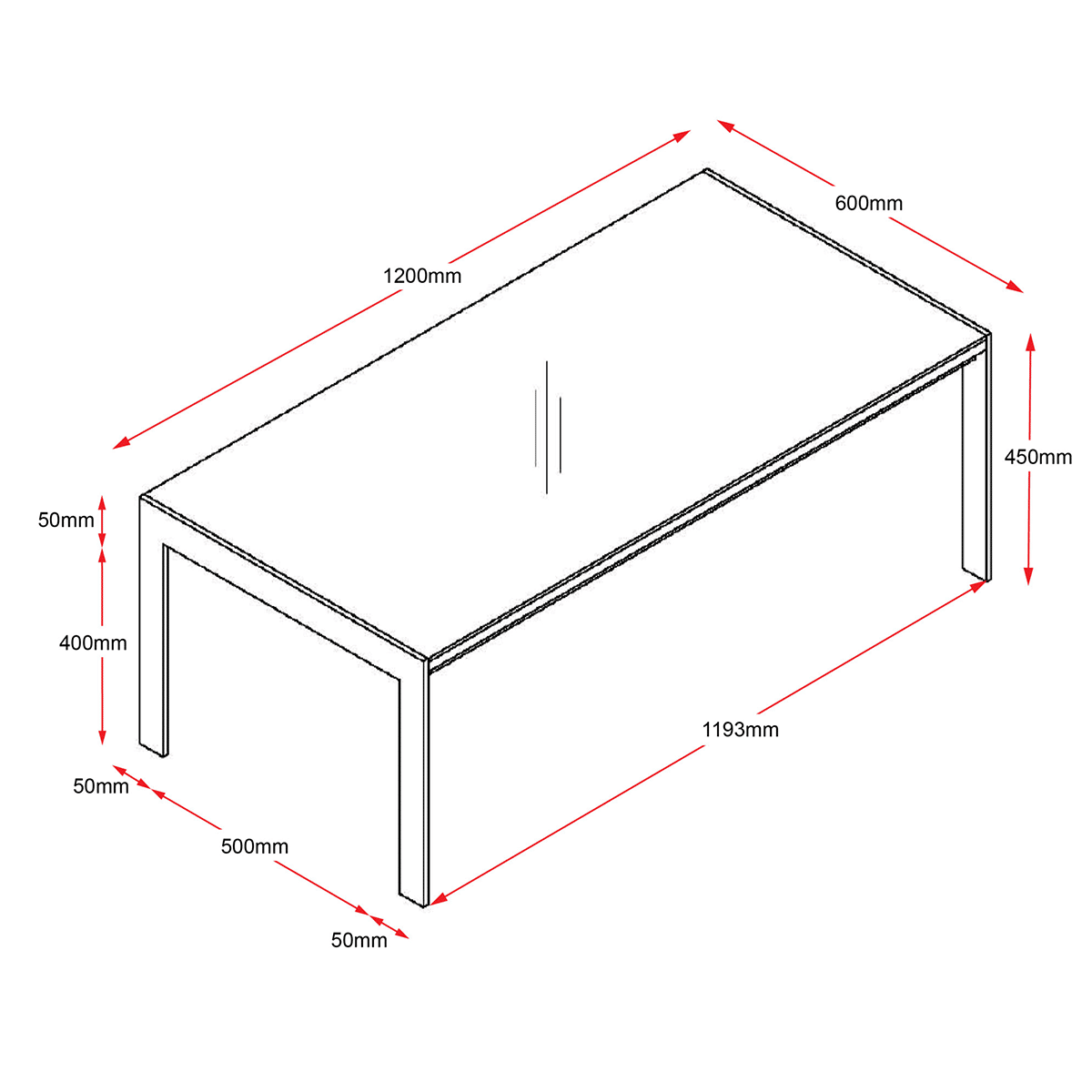 - Rectangular top: 600mmW x 1200mmD x 450mmH