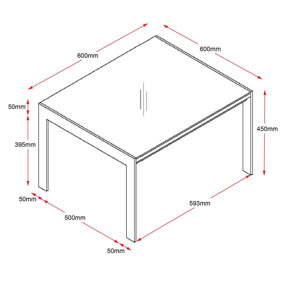 - Square top: 600mmW x 600mmD x 450mmH