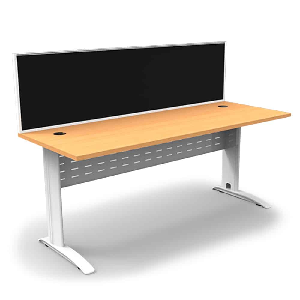 The Diamond Space Office Desks are made from durable E0 board, with dual cable hole cut-outs to help with cable management. Powdercoated metal makes up the frame, with 3 colours to choose from. It also comes with a perforated modesty panel and adjustable levelling feet to keep the top level on any floor. Enjoy your privacy with the desk-mounted screen, which is pinnable and has acoustic qualities to dampen sound. Check out our Diamond Deluxe to see a slightly bigger version with a scalloped edge instead of cable holes.