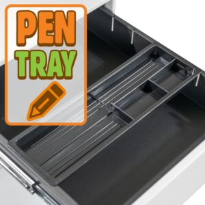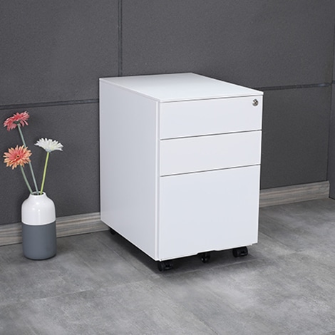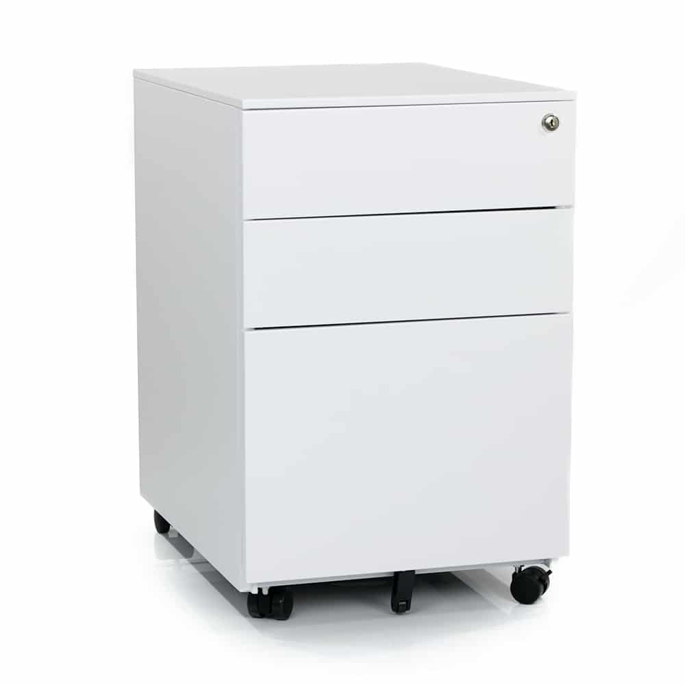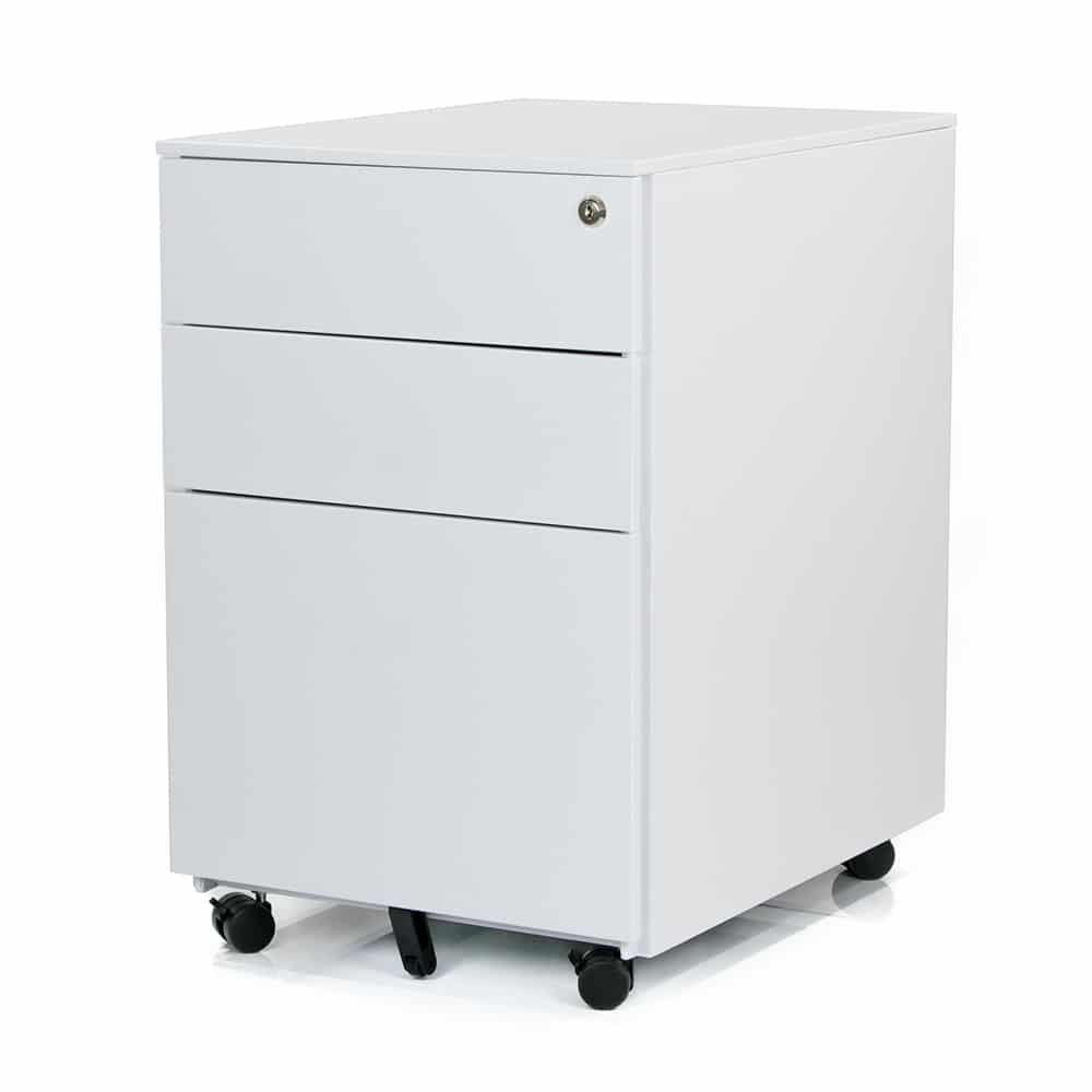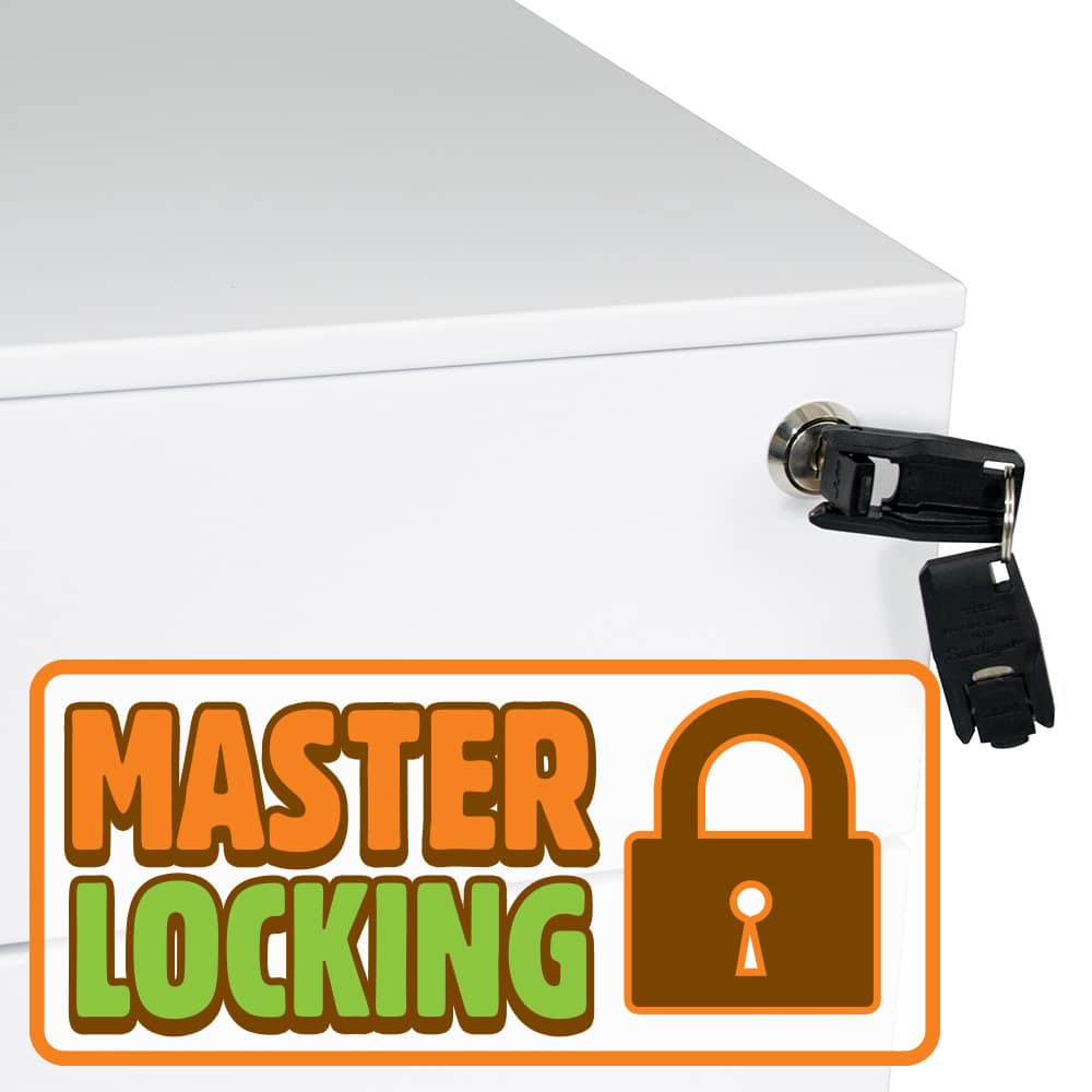 The Dylan Steel Mobile Pedestal is a flexible, durable and affordable office storage solution. With 2 spacious personal drawers, 1 sideways file drawer and a handy pen tray, you ll have less clutter on your desk and more leg room in no time! Built tough with heavy dutysteel, this pedestal is the perfect mix of sturdy and portable, with an extra castor wheel on the file draw for added stability. Get peace of mind with the added security of a master key lock to keep your files and personal items safe. Available in two stylish colours (black or white powdercoat), the Dylan Mobile Pedestal arrives fully assembled and is backed by a massive 10-year warranty.