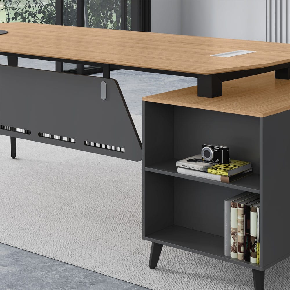 This desk has plenty of storage space as well, with a variety of different compartments. On the front of the return, you can display items where everyone can see on the 2 built-in shelves. For more privacy and accessibility, on the user side of the return there is a single drawer with storage compartment above, a 2 door cabinet, and a nook to put your pc. It even comes with a cable hole so you can run power to your computer while keeping cables out of the way.