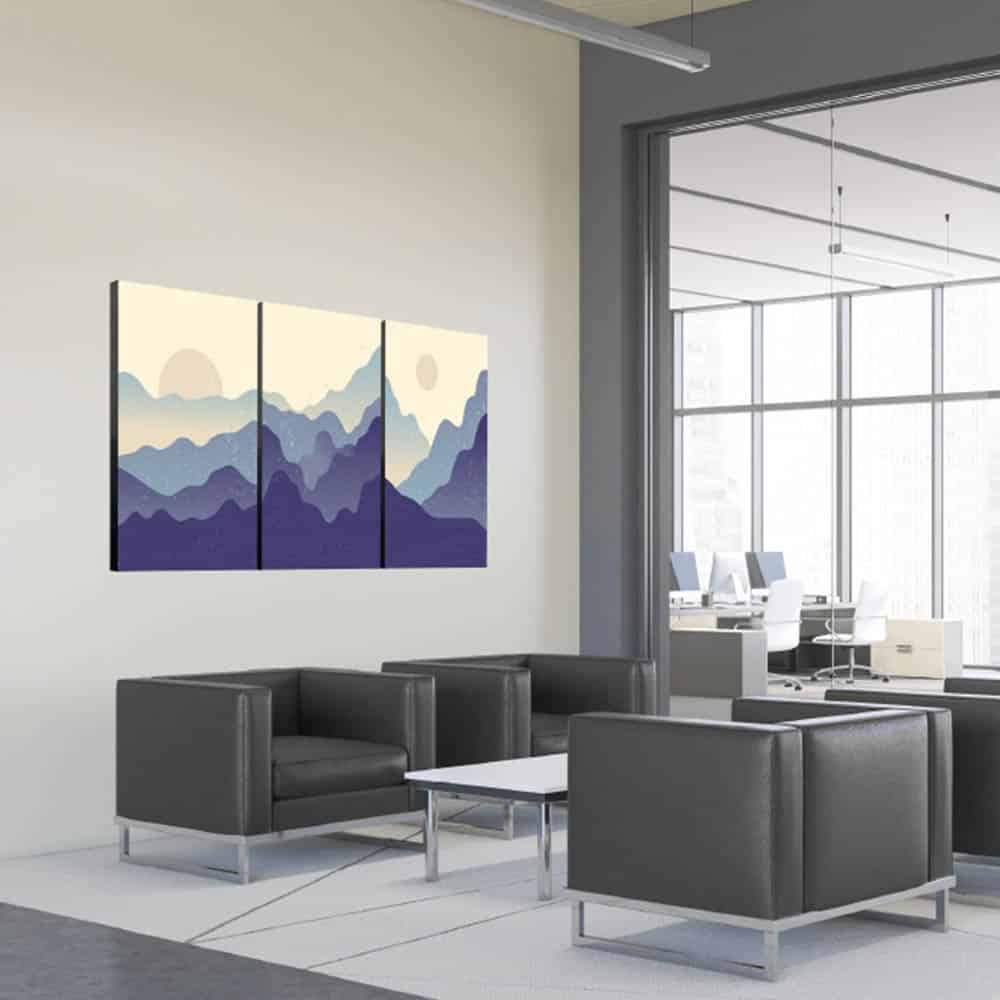 These designs work best as 3 panels, but can be bought as individuals here. Our acoustic art comes in 6 different size choices, so you can fit your space perfectly. A great way to brighten a room while creating some quiet, our Mana Acoustic Art is sure to impress in every way.