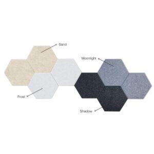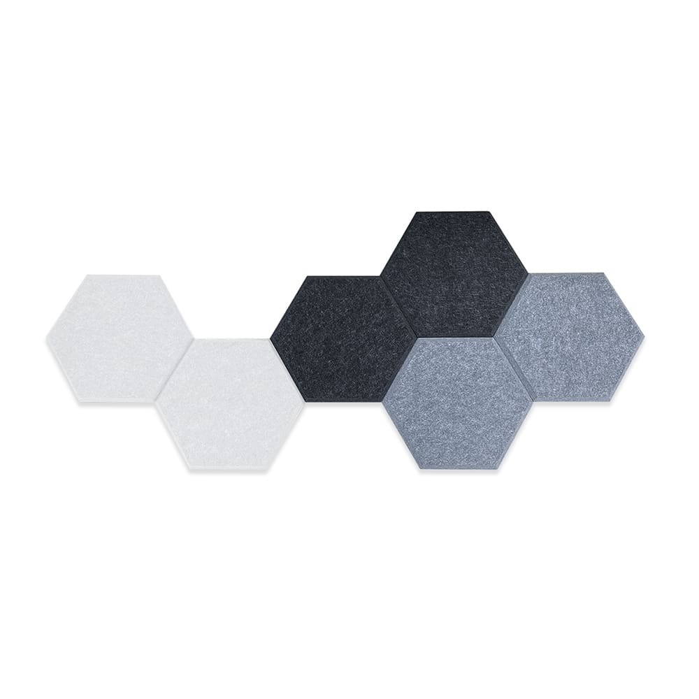 Perfect for either home or the office, Mana Acoustic Hexagons offer a simple, flexible and stylish way to reduce noise pollution in the room. Our acoustic hexagons come in a variety of colours and can be tiled however you like, making the only limit your imagination. The beveled edge adds a textured look to the honeycomb pattern of the hexagons, and their basic design means that they can match any space. This nifty little acoustic solution is designed and made right here in Australia, and can absorb 45% of ambient noise, made from pinnable fabric which allows these to be used as pin boards as well as acoustics.
