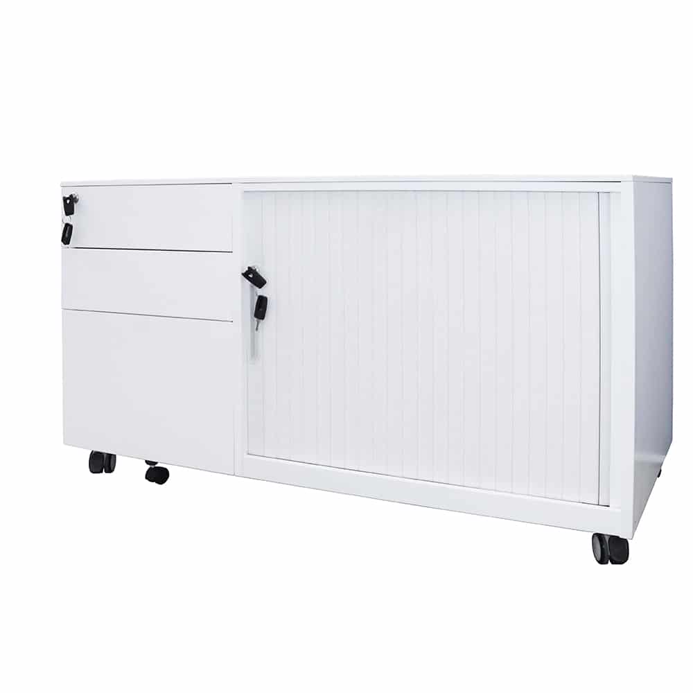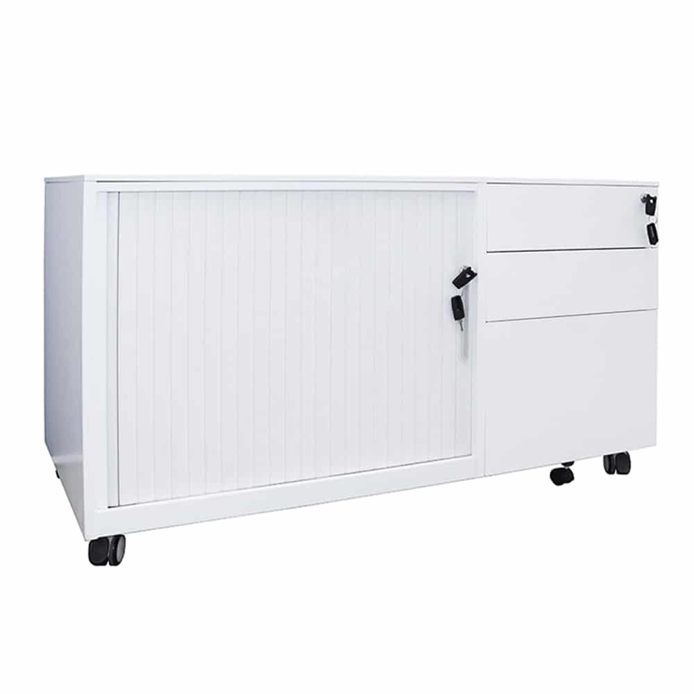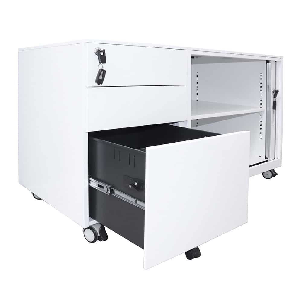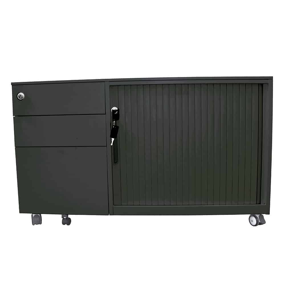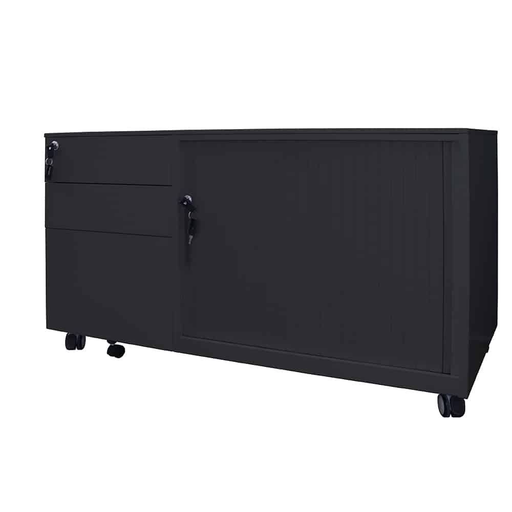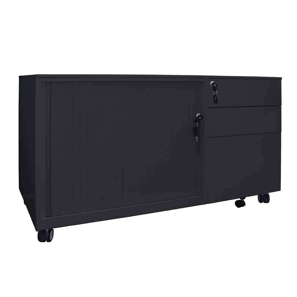 Our Mobile Caddy Unit is a great versatile storage option for the office or home office, especially for those who need more storage than a standard Mobile Pedestal offers. Made from full steel construction, the caddy has 2 personal drawers, 1 file drawer and tambour door storage space with a shelf included for all your storage needs. All the components are high quality, including ball bearing drawer runners for smooth action, heavy dutyhard floor castors which are lockable, and it has an anti-tilt mechanism for added stability. Both the drawers and shelving space are lockable to preserve your privacy, and it even has an extra wheel on the bottom drawer for more support. Available in either black or white powdercoat, and with the tambour section on the right or the left, this is a high quality product with the flexibility to suit your every need.