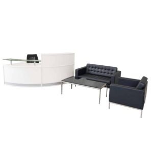 For those in search of a classic, simple look to compliment their business, don’t look past the understated elegance of the Modello Reception Counter. Finished in white with a silver kickplate, the Modello reception counter will look great in any working environment. Its curved shape gives a sense of movement, and creates a focal point in the office. The counter is made of 2 pieces, a main tall hob and a return with a glass hob on chrome pillars, and these can be configured in any way you like.