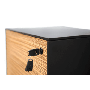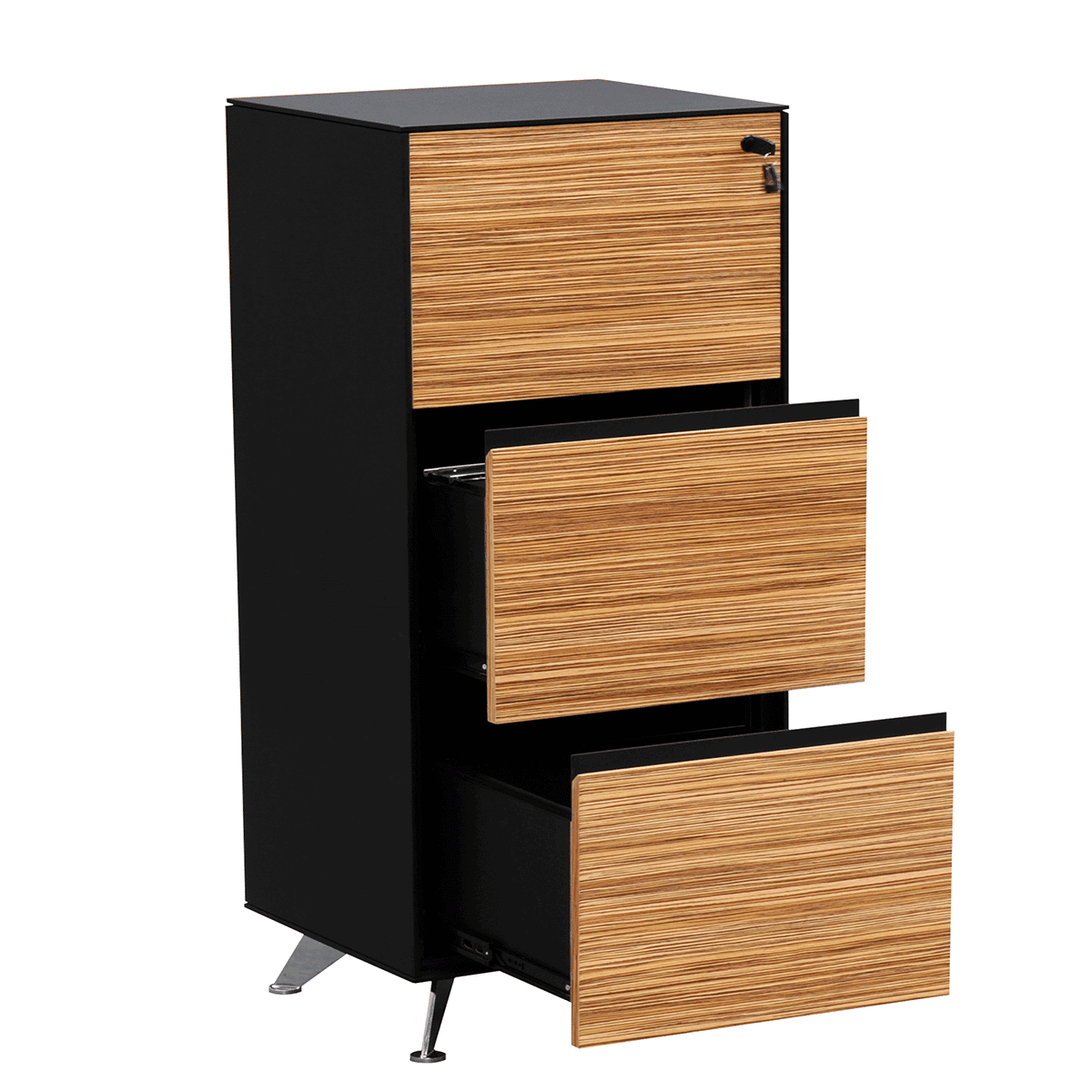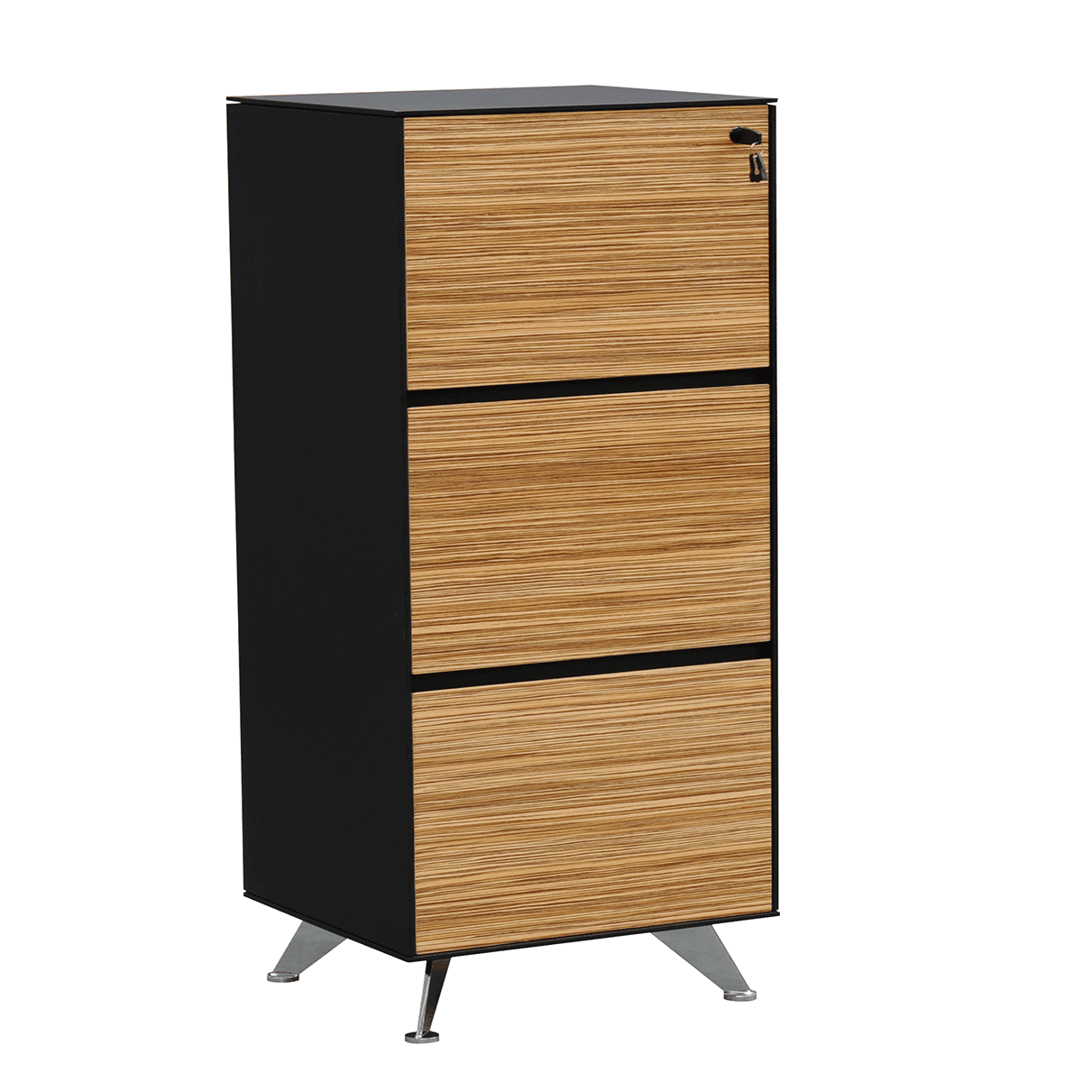 One of the storage solutions in the Nova Range is the Nova Filing Cabinet. This is a small filing cabinet used for storage that can be placed anywhere in an office. It works best as a stand-alone unit, where it can be accessed by either a range of people or for personal use. Made from high quality materials and bearings, the drawers slide open with no trouble at all. It has a multi-lock feature, so each of its 3 drawers can be secured. The front is made with a bold, high quality Zebrano timber veneer, with a matte black frame and aluminium feet.