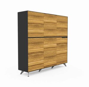 One of the storage solutions in the Nova Range is the Nova Six Door Cabinet. This is a unit used for storage that can be placed anywhere in an office. It works best as a stand-alone unit, where it can be accessed by either a range of people or for personal use. The top can be used as a surface to place small items, and the cabinet itself comes with 6 total compartments, one of the doors with a cutout. It comes in 3 different heights, and also is available with 4?doors or 4 drawers. The front is made with high quality Zebrano timber veneer, with a matte black frame and aluminium feet.