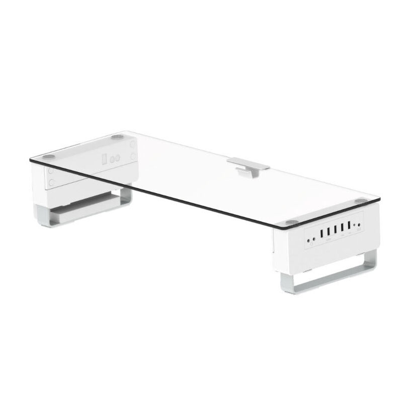 The Smart Glass Monitor Riser boasts a minimalist design with a stylish tempered glass surface, offering a range of practical features.