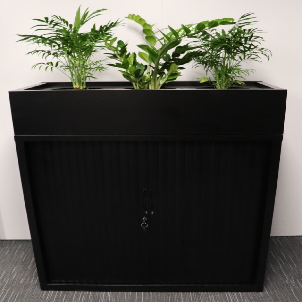 Tambour Storage Cupboard with Planter Box: Lockable, Adjustable Shelves with Integrated Plant Display