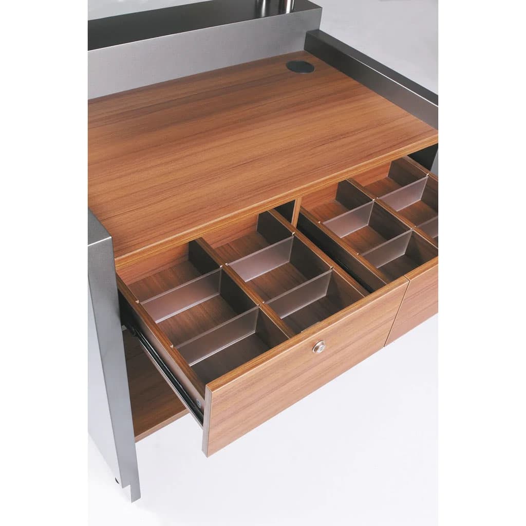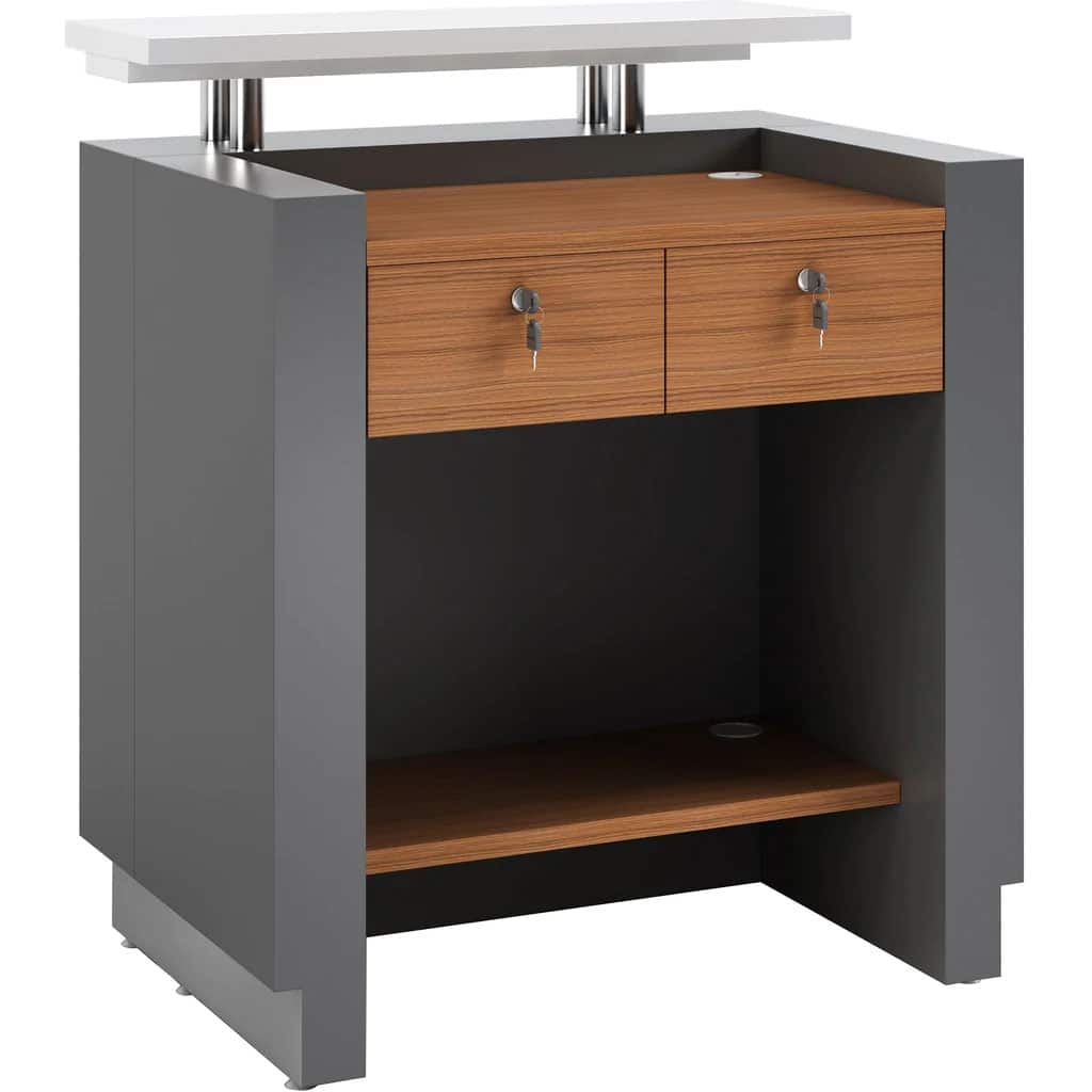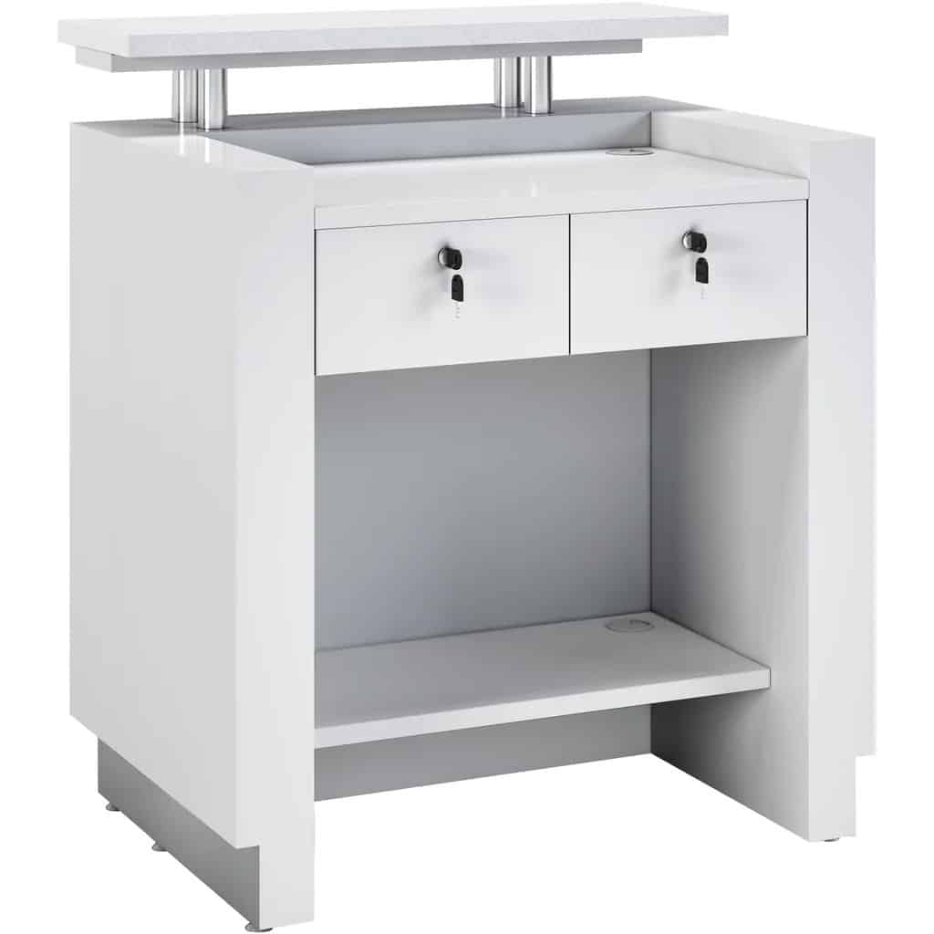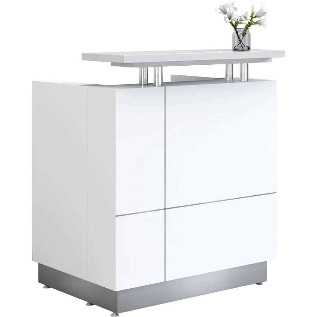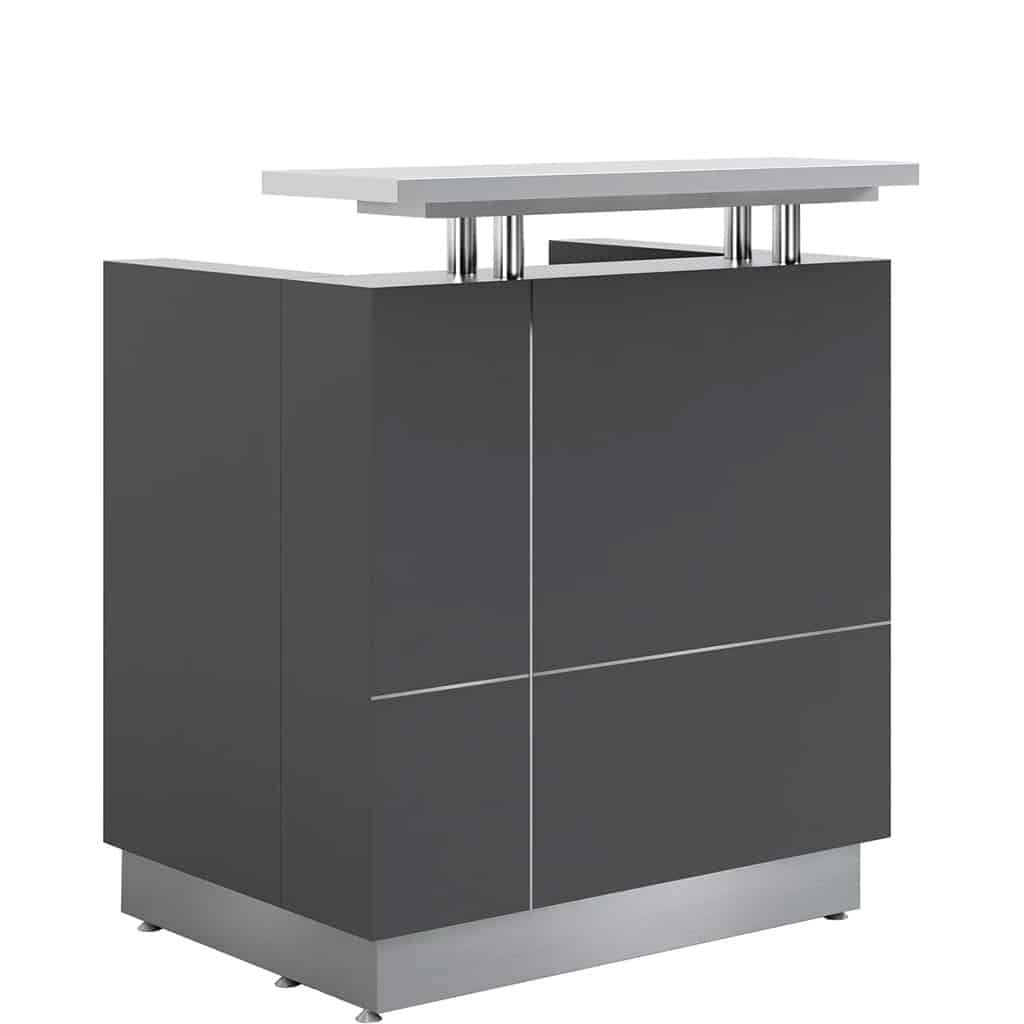 Emblematic of the Venice reception is the jade white stone hob, which is supported by chrome pillars. Combined with the aluminium trim lines and stainless steel kick plate, the chrome-silver becomes an accent colour in-between the white and the grey. It keeps the design simple yet attractive, and makes it a flexible design that can fit in with most other furniture. The Venice Bar is a shorter version of the regular Venice counter, meaning you can fit it in a smaller space if you’d like a small workspace. Style isn’t the only strength of this reception, as it is made with high quality materials and fittings, and comes with the side box on either the left or right depending on your personal preference. For the modern professional, the Venice is the way to go.