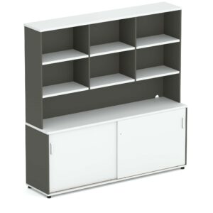 Wonder Credenza & Hutch: White and Charcoal Storage with Overhead Shelving for Organised Offices